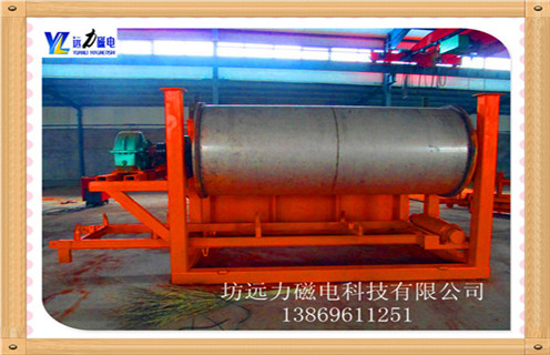非磁性有色金屬材料在重力作用下落在磁性材料的外面.這些材料隨著筒體的旋轉,非磁性材料在重力作用下從氣缸下落,在滑槽中.含鐵磁性材料吸附在圓筒的表面上并繼續旋轉,直到其不具有磁力.材料從帶式輸送機排出,并最終分成含鐵材料和無鐵材料.
