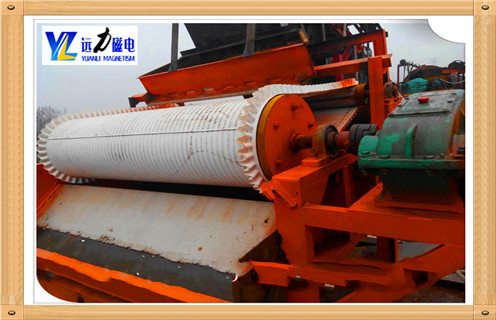 2、礦粒經輸送帶被送入上磁輥分選,由于鐵礦的礦粒有磁性,立即被強磁場吸附在磁輥上,脈石粒由于沒有磁性,磁輥的強磁對它不產生吸力,隨著磁輥的轉動,礦粒一直被吸在磁輥上,而脈石粒在磁輥轉到前端位置時被拋出掉在隔礦板的前面,礦粒繼續被磁輥帶到脫磁區時自動掉入一選集礦斗收集為精礦成品。