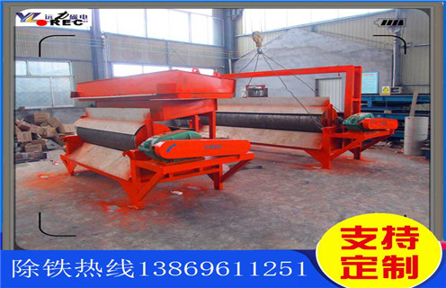4、含有鐵磁性雜質(zhì)的物料通過受料斗經(jīng)電磁振動給料機(jī)均勻的下到第一道輸送皮帶上,當(dāng)物料通過強(qiáng)磁輥時,鐵磁性物質(zhì)被磁力吸引被吸附到強(qiáng)磁輥上,隨著皮帶的轉(zhuǎn)動使其從磁場脫離并落入收集斗中。其它物料和沒有選凈的鐵磁性物質(zhì)隨溜槽進(jìn)入下一級磁選皮帶進(jìn)行分選,原理同上。最后選出合格的產(chǎn)品。